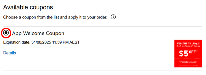 We offer $5 off coupons to customers who have registered a new online account. The coupon can be used both online and at any of our UNIQLO Australia stores, and has a minimum spend of $50. Please allow 24 hours for your coupon to appear.